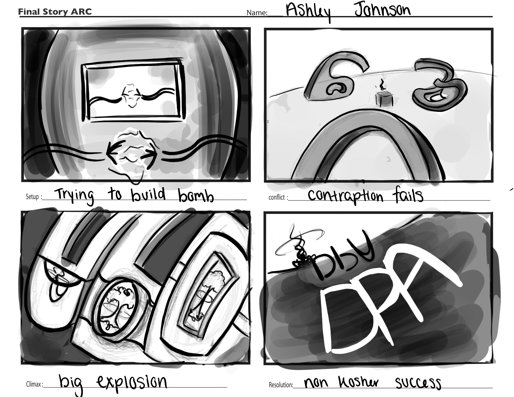 One of the most fun challenges this project brought was figuring out how to express emotion through posing characters who had no faces and traditional bodies. In the boarding process, I focused on pushing the characters posing through their "spines" to help portray their emotions.